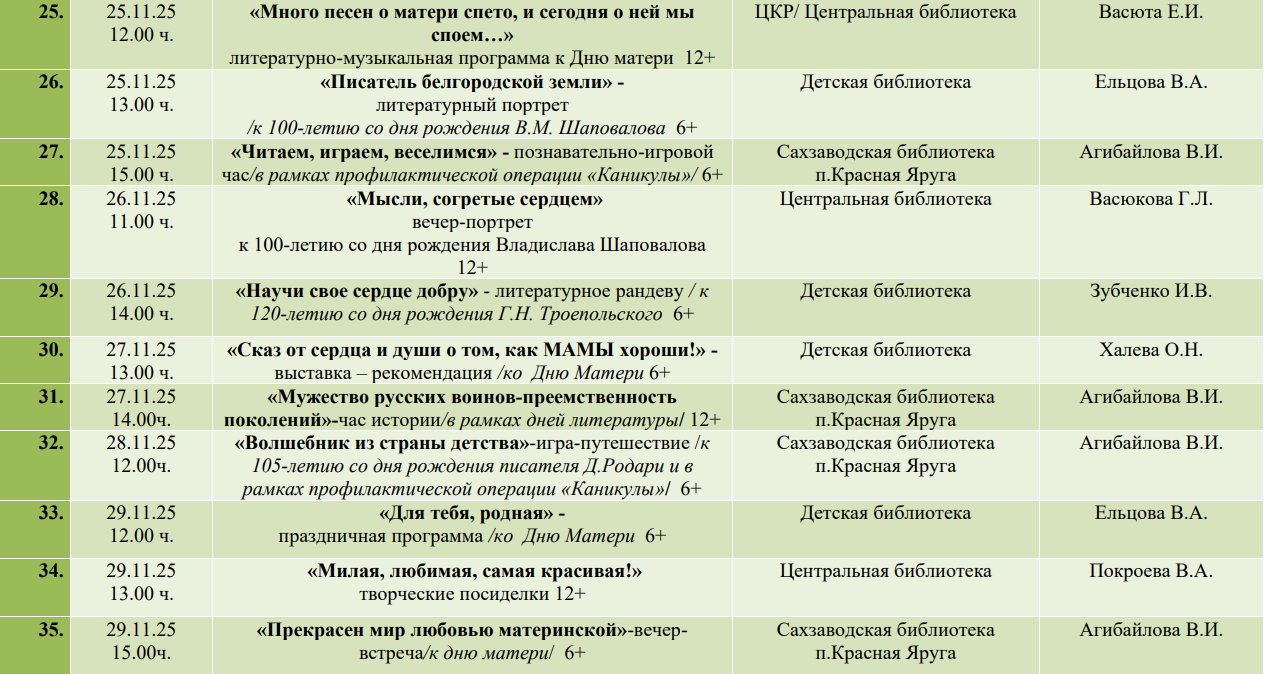 ПЛАН МЕРОПРИЯТИЙ МБУК "ЦЕНТРАЛЬНАЯ БИБЛИОТЕКА КРАСНОЯРУЖСКОГО РАЙОНА"