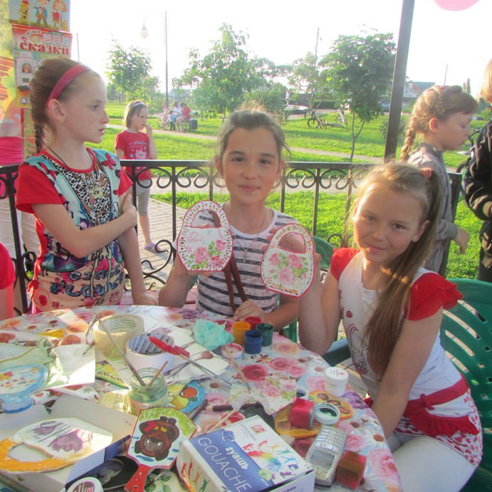 Каждый желающий ребенок вместе с родителями мог стать участником мастер-класса по декупажу. Здесь библиотекарь показывала, как с помощью техники декупажа можно украсить деревянные изделия. Так же дети участвовали в литературных викторинах, играли в подвижные и настольные игры (Шашки, Удивительные животные, Чудо-техника, Твистер и т.д.), разукрашивали картинки, и с интересом рассматривали детские журналы. Мероприятие прошло очень весело, дети получили заряд хорошего настроения и памятные подарки.