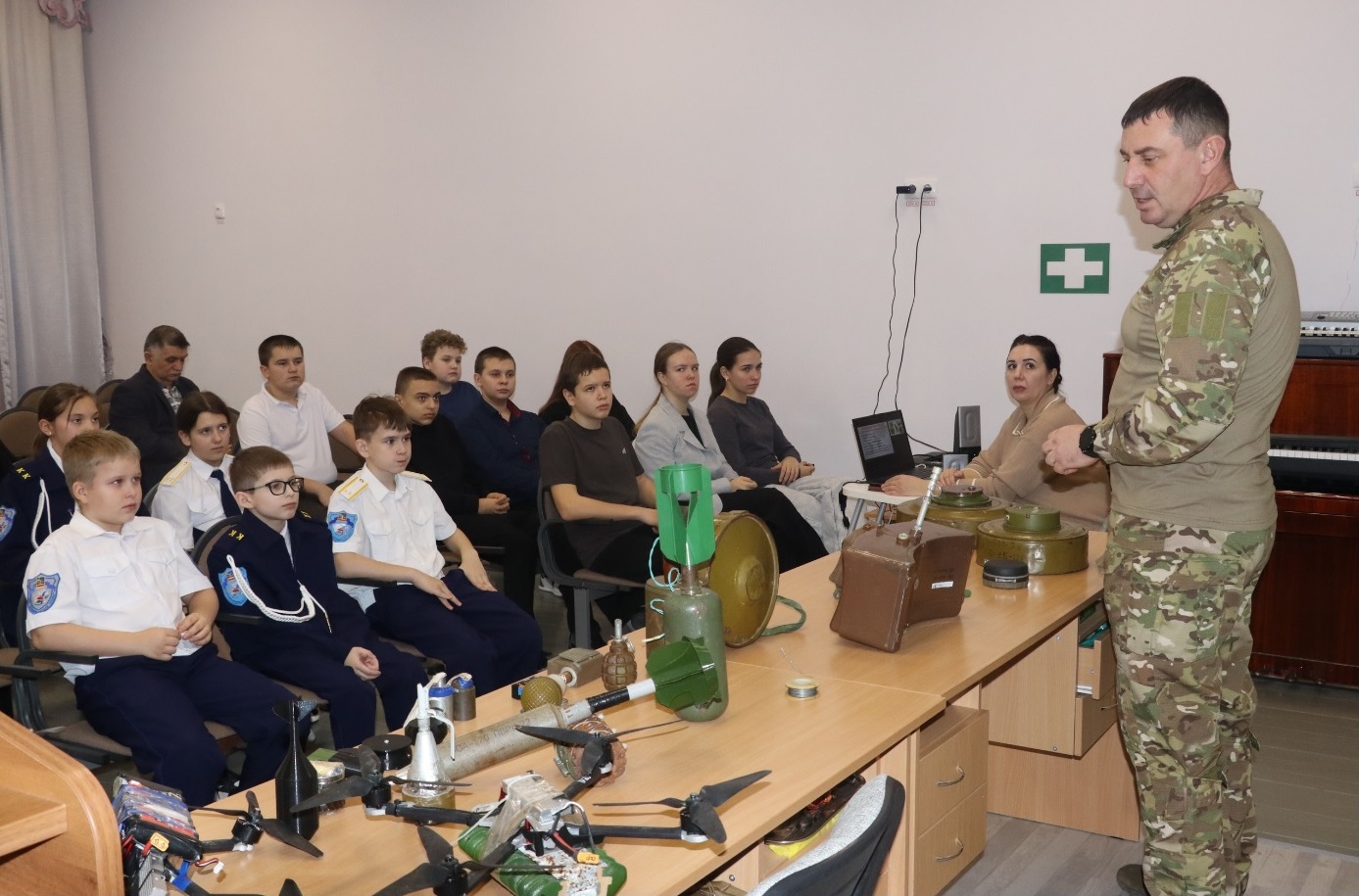 В завершении мероприятия ребята с интересом рассмотрели макеты взрывных устройств, беспилотных летательных аппаратов и задали интересующиеся вопросы.