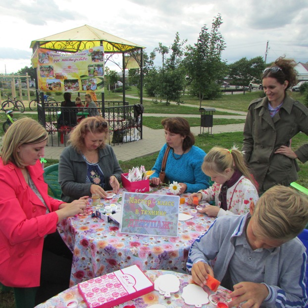 После просмотра библиотекарь порекомендовал детям прочитать книжку «Повесть о Петре и Февронии», в которой повествуется об удивительной мудрости и любви. В этот знаменательный день сотрудники детской библиотеки провели для жителей Краснояружского района в парке Победы акцию «Сладкая ромашка». Присутствующим на празднике семьям вручали шоколадную конфету «Ромашка» с прикрепленным к ней поздравлением с праздником. Для детей младшего и среднего возраста прошел мастер-класс «Ромашка счастья» в технике декупаж. Девочки и мальчики вместе с родителями под руководством библиотекарей старательно делали на деревянных заготовках в виде сердечек цветочные композиции. Во время семейного творчества библиотекари рассказывали о том, кем были Петр и Феврония Муромские, и почему именно в их честь возник этот праздник.