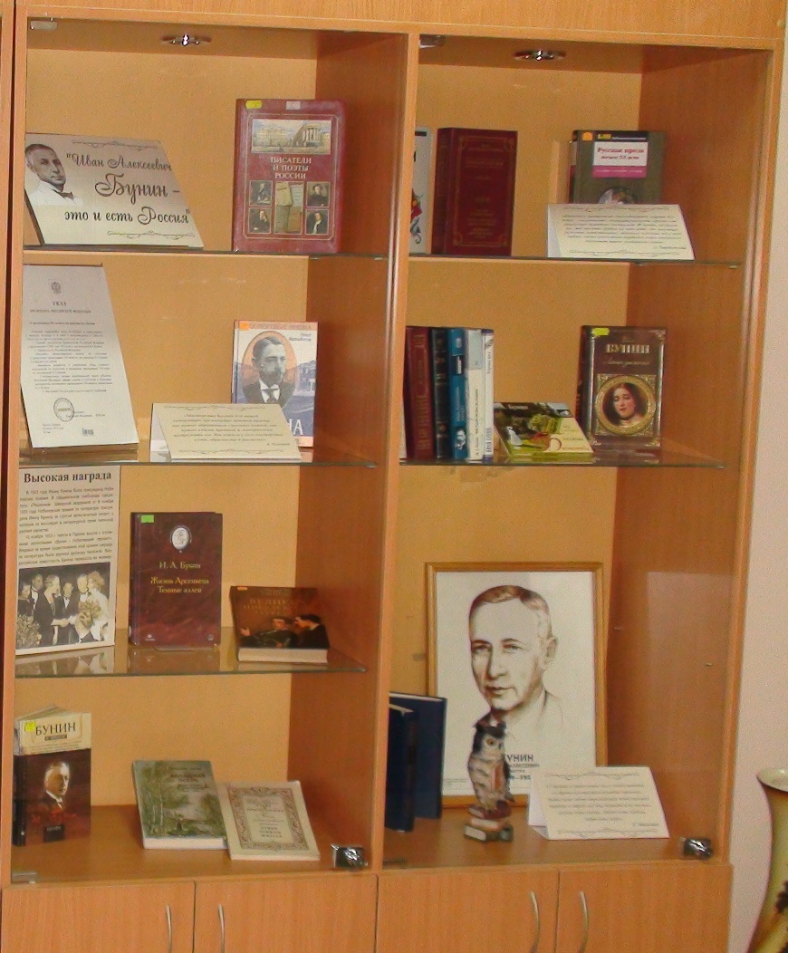 В фойе отдела обслуживания Центральной библиотеки открылась книжная выставка «Иван Алексеевич Бунин – это и есть Россия», посвященная 150-летию со дня рождения русского писателя, поэта, почётного академика Петербургской академии наук (1909), первого русского лауреата Нобелевской премии по литературе (1933) Ивана Алексеевича Бунина (1870-1953).