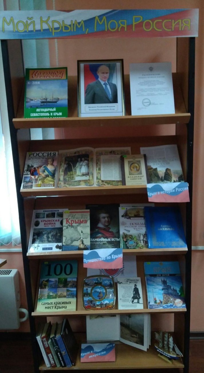 В честь исторического события – Дня воссоединения Крыма с Россией в Интерес-Центре Центральной библиотеки открылась книжная выставка «Мой Крым – Моя Россия». Она охватывает значительный хронологический период: от крещения князя Владимира в древнем Херсонесе до принятия в состав Российской Федерации Республики Крым и города Севастополя в марте 2014 года.
