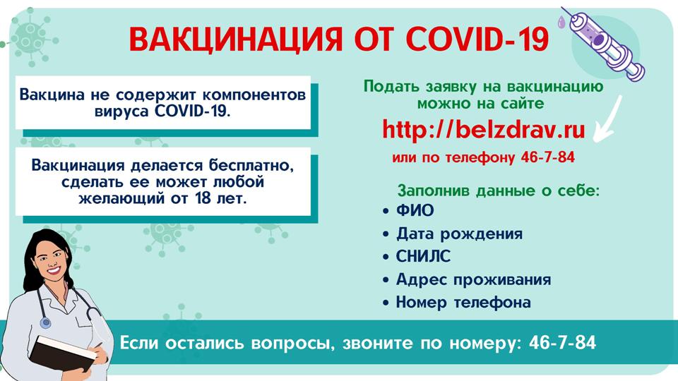 В Белгородской области началась массовая вакцинация от коронавирусной инфекции. Теперь провакцинироваться может любой желающий, подав заявку на сайте Департамента здравоохранения belzdrav.ru или Краснояружской ЦРБ krasnyaruga-crb.belzdrav.ru.