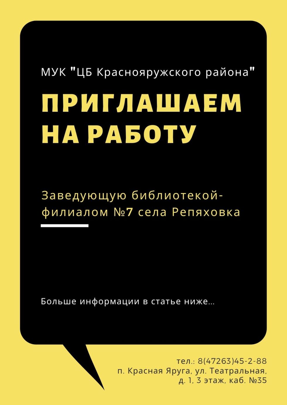 Муниципальное учреждение культуры «Центральная библиотека Краснояружского района» приглашает на работу заведующую библиотекой-филиалом №7 с. Репяховка