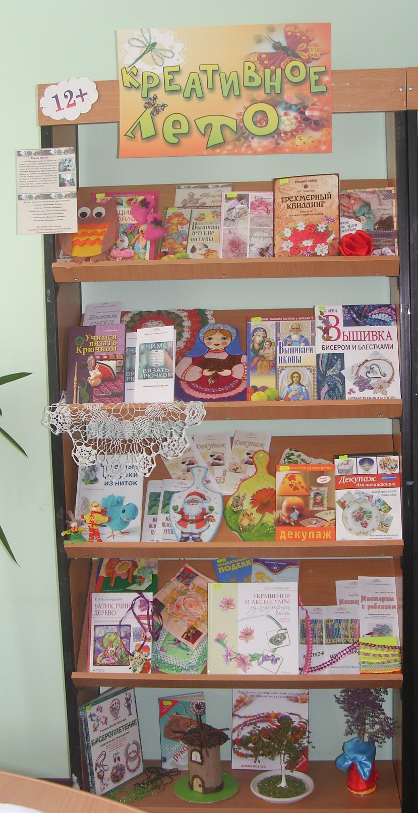 В читальном зале отдела обслуживания пользователей Центральной библиотеки организована необычная выставка. Предназначена она для читателей разного возраста, которые с удовольствием занимаются рукоделием и воплощают свои творческие идеи. На выставке представлены книги по вязанию крючком и спицами, росписи по дереву и ткани, бисероплетению, квилингу, плетению фенечек и браслетов, изготовлению различных фигур из ниток, фетра, лент. Полочки на выставке украсили работы читателей. Здесь и деревья из бисера и чудесная мельница из картона и зерен кофе, браслеты из лент и резиночек, животные из фетра и разноцветных ниток, разукрашенные доски, цветы из лент и многое другое.