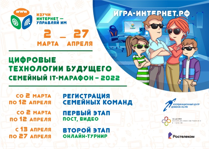 Семейный IT-марафон будет проходить со 2 марта по 27 апреля 2022 года на официальном сайте проекта «Изучи интернет – управляй им!» игра-интернет.рф.