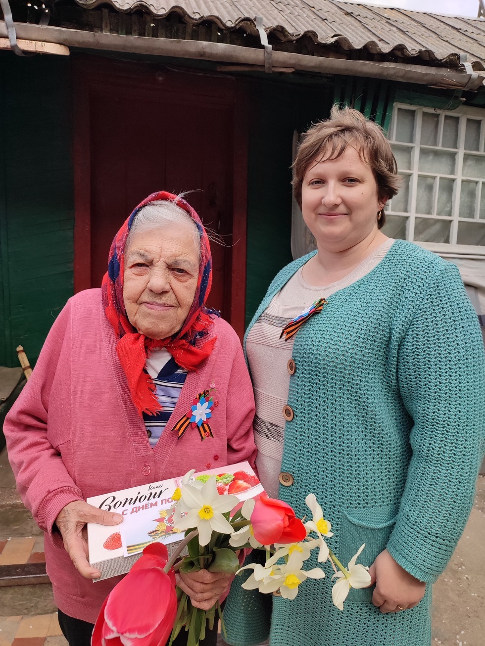 Поздравительные открытки со словами благодарности и пожелания долгих лет жизни, живые цветы, сладкие подарки, а также главный символ Победы - брошь из георгиевской ленты, изготовленную волонтерами библиотеки были вручены Фроловой Н.А., Тарковской А.А., Карабановой З.А., Руденко М.М., Богатченко Л.А., Гребеник Л.Ф.