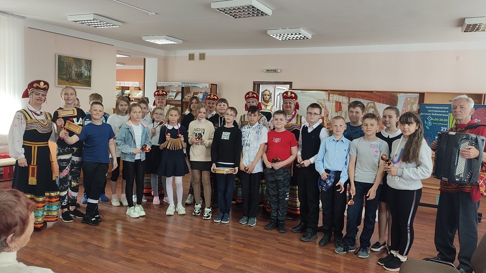 Украшением встречи стал мастер класс по игре на музыкальных ударных инструментах. Юные гости мероприятия поучаствовали в импровизированном фольклорном ансамбле. Вместе с участником вокального ансамбля «Славянский мир» Рыбалка Ириной ребята с большим удовольствием сыграли на бубнах, ложках, круговой трещотке, коробочке, рубеле. Импровизированный ансамбль произвел на детей очень большое впечатление.