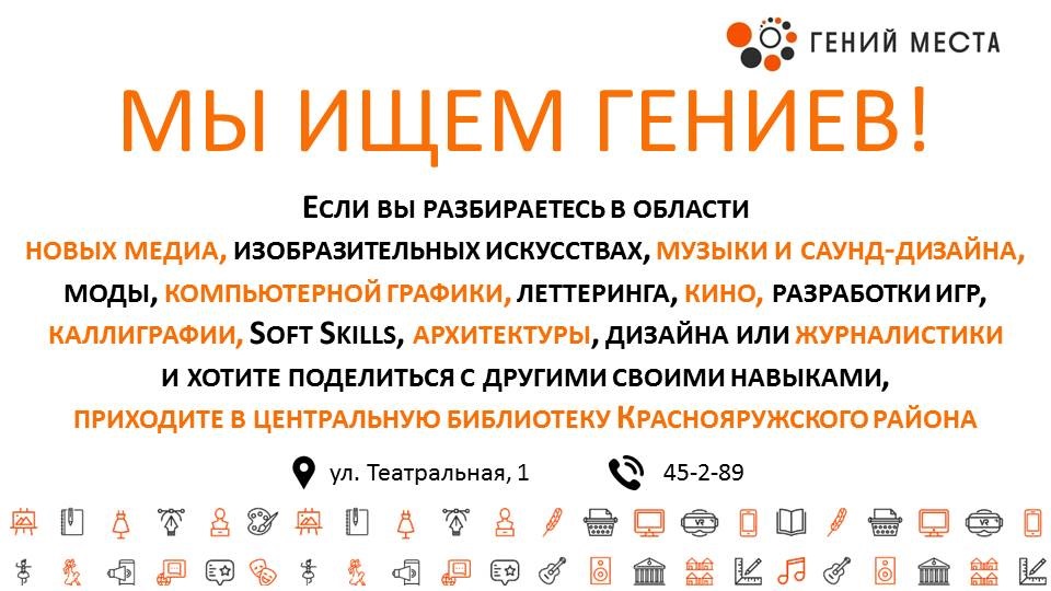 Друзья, если вы желаете получить доступ к необходимым знаниям, обучиться чему-то новому, реализовать собственные проекты в области креативных индустрий ждем вас в точке концентрации талантов «Гений места». Здесь бесплатно, без ограничений и регламентов вы сможете общаться и работать индивидуально и в группах, прийти со своей идеей, найти ресурсы для воплощения, единомышленников, инвесторов для готового проекта.