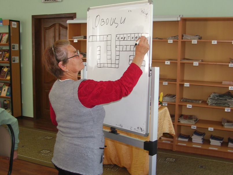 Члены кружка с удовольствием разгадывали кроссворд «Овощи», всем очень понравилась игра «Найди на ощупь», где участникам предлагалась с закрытыми глазами достать из мешочка какой-нибудь овощ и узнать его, разгадывали загадки, с особым энтузиазмом «собеседницы» приступили к изготовлению из овощей и фруктов персонажей сказки «Чипполино». А завершилось заседание чаепитием и созданием совместной книжно-иллюстрационной выставки «Щедрая осень»