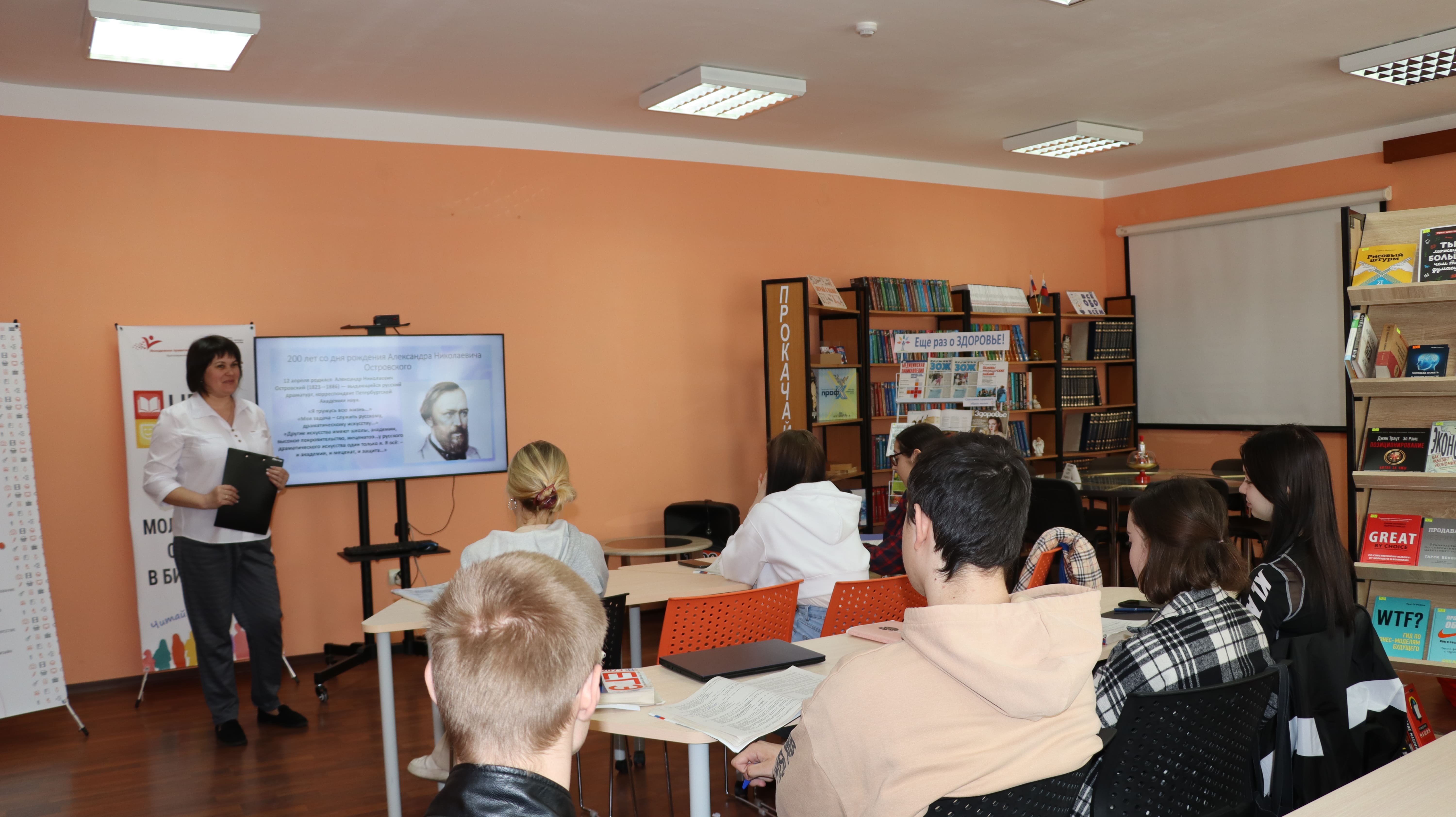 С помощью слайд- презентации библиотекарь отдела обслуживания рассказала присутствующим о биографии Александра Николаевича — замечательного русского писателя, автора сорока семи оригинальных пьес, создателя русского национального театра.