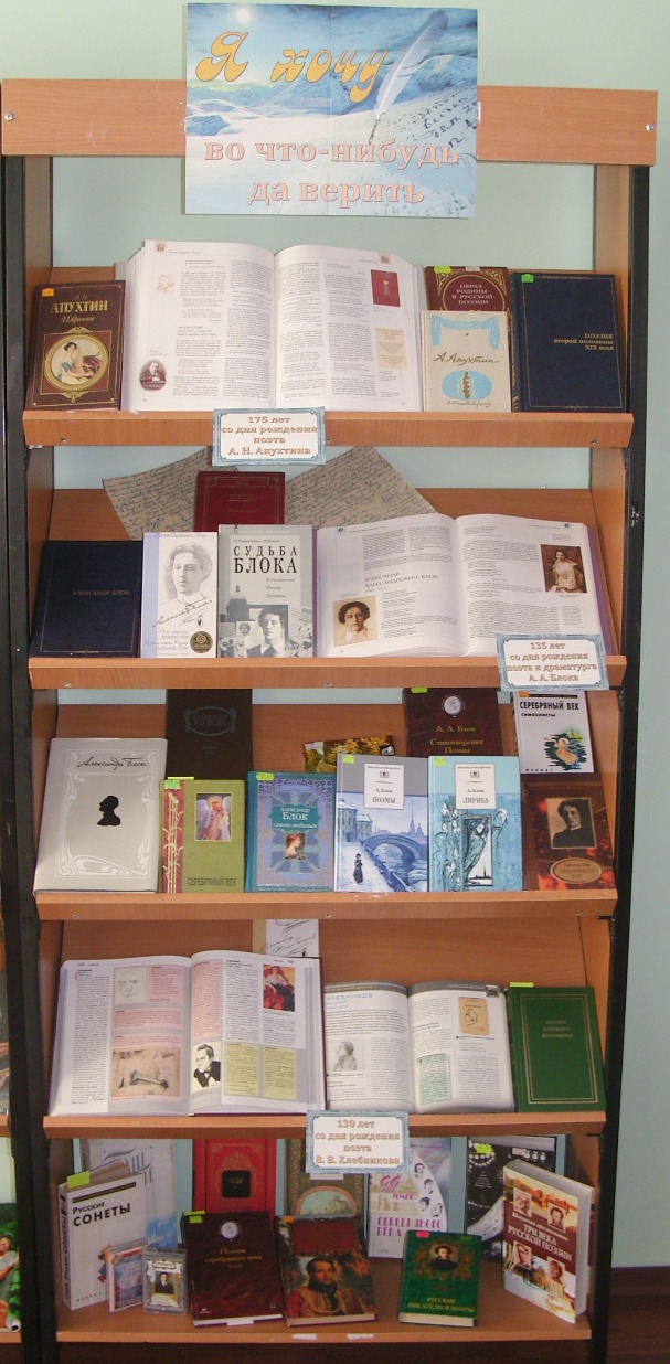 В читальном зале отдела обслуживания открылась выставка «Я хочу во что-нибудь да верить», посвященная творчеству поэтов: В. Хлебникова, А. Блока и А. Апухтина. На выставке представлены книги о творчестве и жизни выдающихся лириков России. Их объединяет не только поэзия, но и месяц рождения – ноябрь.