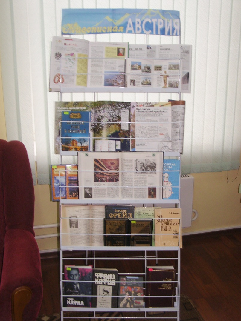 «Живописная Австрия» - книги, представленные на выставке познакомят посетителей с родиной великого Моцарта и венского вальса, центром горнолыжных курортов. Интересным кажется тот факт, что в это стране много гор, лесов и чистых озер, а в архитектуре по сей день прослеживается специфика традиционной культуры австрийцев. Поражают своей красотой Альпы. Все это привлекает миллионы туристов, которые ежегодно посещают эту удивительную страну. Особое место на выставке уделено биографической литературе об известных австрийцах. Так, в мировое музыкальное искусство вошли: И. Штраус (создатель венского вальса), Ф. Гайдн и Ф. Шуберт, В. Моцарт (представитель венской классической музыки) и др. Австрийскую литературу представили такие известные писатели как, Стефан Цвейг и его произведения «Мария Антуанетта», «Триумф и трагизм Эразма Роттердамского», «Бальзак» и др., Роберт Музиль - автор циклов рассказов «Соединения», «Три женщины», прозаического сборника «Прижизненное наследие», драмы «Мечтатели» и комической пьесы «Винценц и подруга значительных мужей», двух романов «Душевные смуты воспитанника Тёрлеса» и «Человек без свойств» (оставшегося незаконченным), а также многочисленных эссе, речей, театральных и литературно-критических статей.