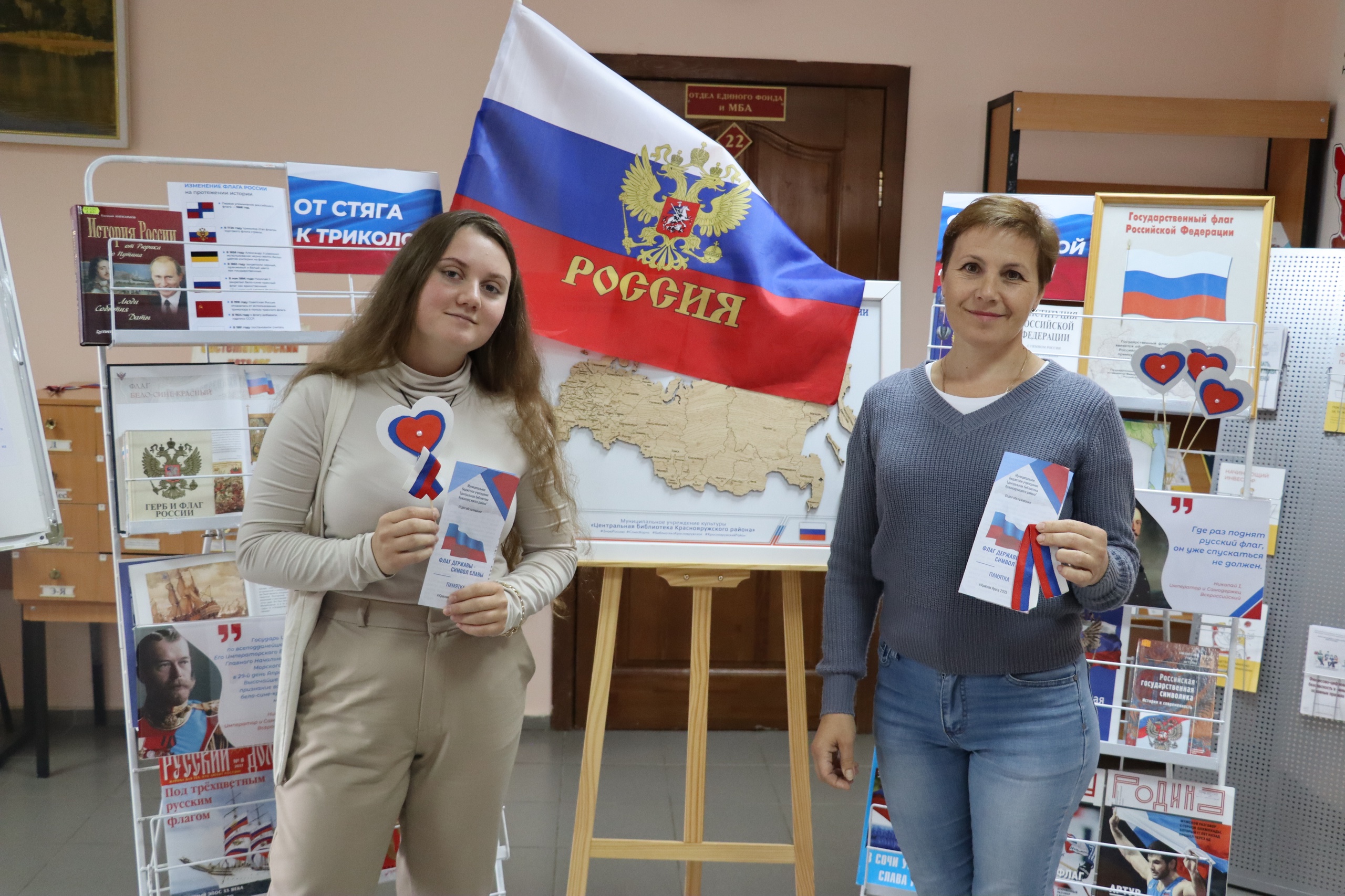 Гости и читатели библиотеки также имели возможность посетить выставку «Символ великой державы», на которой были представлены энциклопедии и издания о государственных символах. Здесь можно было узнать множество интересных фактов и историй, связанных как с флагом, так и с другими важными символами России.