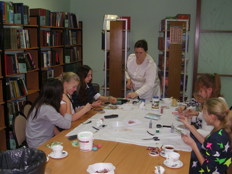 В отделе обслуживания прошел семейный мастер-класс по декупажу. Это – очень популярная современная техника декорирования различных предметов. Суть техники декупажа заключается в том, что тонкий слой бумаги с декоративным рисунком наклеивается на поверхность предмета, создавая при этом иллюзию ручной росписи. Участники мероприятия декорировали новогодними сюжетами подставки под горячее. Удивительными и неповторимыми получились приготовленные изделия.