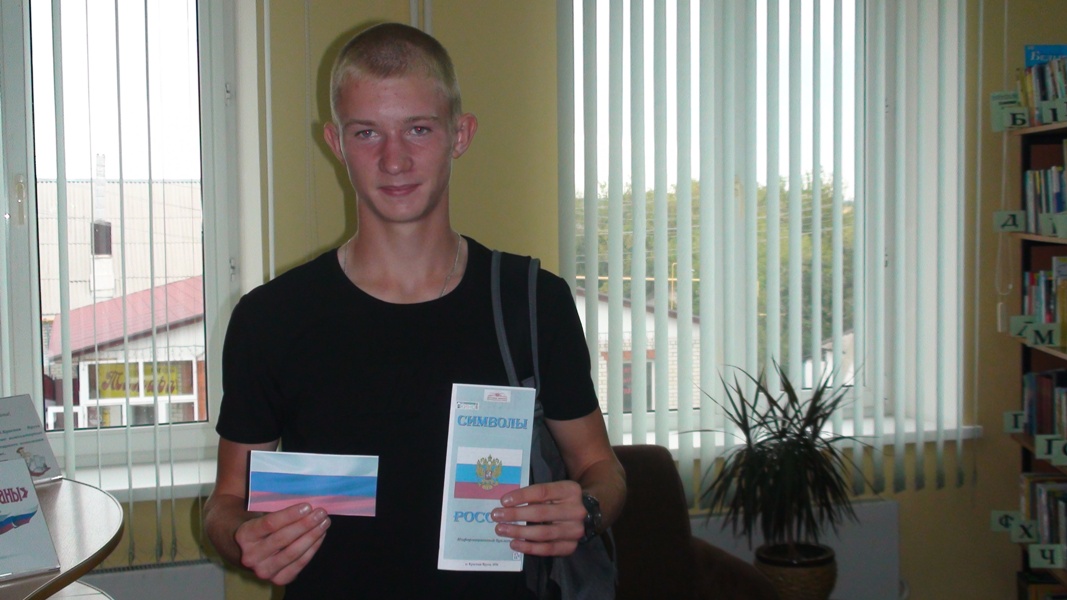 Накануне этого знаменательного события в центральной библиотеке была организована культурно-патриотическая акция «Главный символ страны». Посетители библиотеки получили в этот день информационные буклеты «Символы России» и приняли участие в блиц-опросе, где ответили на вопросы, касающиеся истории возникновения флага, а также других главных символов нашей страны – герба и гимна. Хочется отметить, что большая часть вопросов не вызвала никаких затруднений, и опрашиваемые безошибочно на них отвечали. И что самое главное - все участники акции однозначно утверждали, что флаг РФ вызывает в них чувство патриотизма и гордости за свою великую страну.