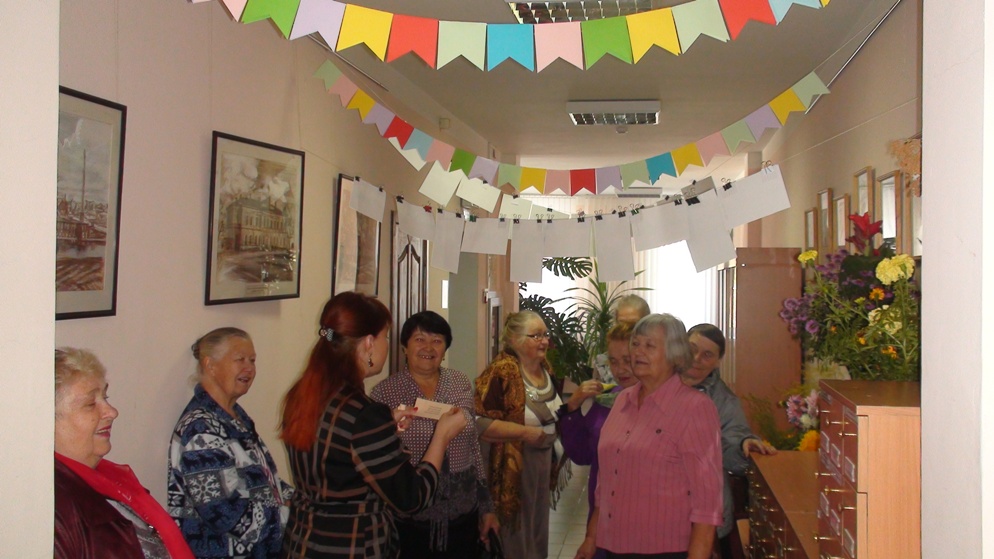 С большим волнением 1 октября участники пришли в библиотеку, фойе которой был украшен разноцветными флажками и фотографиями наших уважаемых пенсионеров. Гостей ждал еще один сюрприз – чаша пожеланий, из которой каждый желающий доставал свернутые записки с пожеланиями счастья, здоровья, удачи, долголетия. В завершении встречи пенсионеры получили на память фотографии.