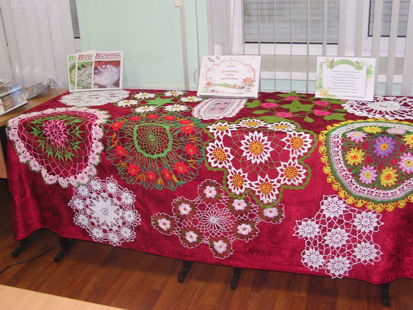 Такое стихотворение характеризует выставку творческих работ в зале периодики нашей постоянной читательницы Аллы Арсентьевны Даниленко. Каждая ее салфетка уникальна. Рукодельница настолько умело подбирает узор, цвета ниток, салфетка становится изысканной, воздушной.