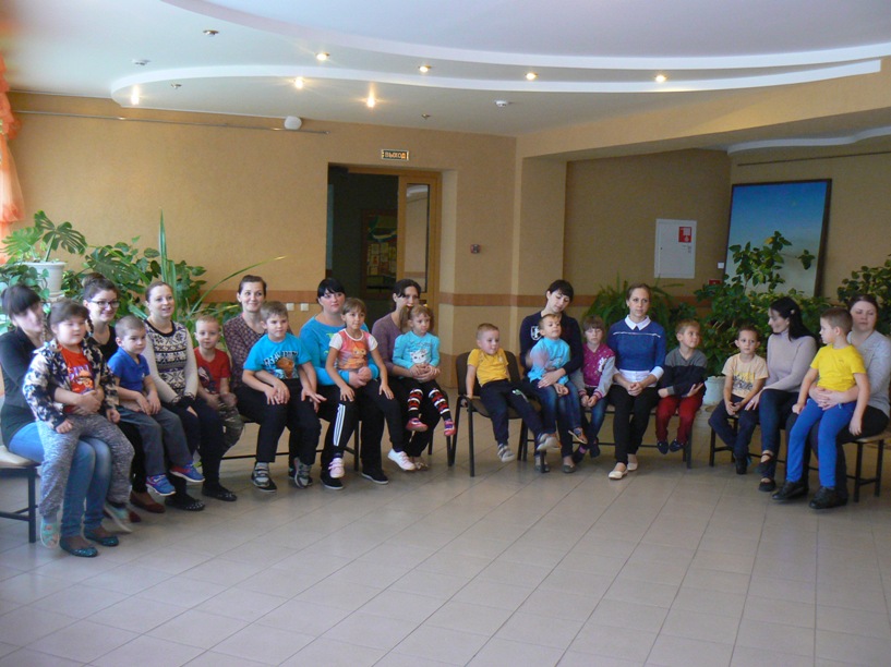 Для мам с детками была подготовлена конкурсно - игровая программа, в ходе которой они разбились на две команды «Карапузы» и «Улыбка». Каждая команда подготовила рассказ о членах своей команды, придумали девиз команды и исполнили песню.