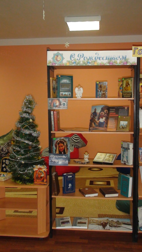 Рождество Христово - великий православный праздник. Ежегодно в рамках этого события в отделе обслуживания организуются выставки и обзоры литературы. В этом году в Интерес-центре была оформлена книжная экспозиция «С Рождеством!». Первый раздел выставки содержит книги и журналы раскрывающие историю возникновения праздника. Вниманию посетителей представлены ярко иллюстрированные энциклопедии и справочные издания, среди которых книги о великих православных праздниках. Во втором разделе экспозиции сформирована подборка художественных произведений о Рождестве, сборники святочных рассказов. В том числе аудио и видеозаписи рождественских бесед и сказок.