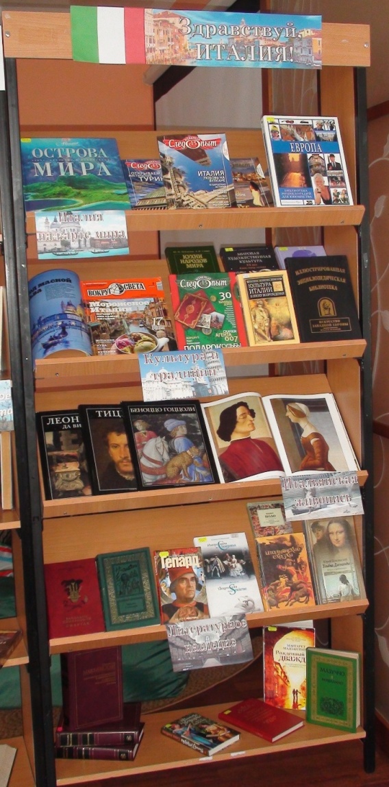 Любителей живописи порадует раздел выставки, посвященный известным мастерам Италии: Беноццо Гоццоли, Тициану, Леонардо да Винчи, Боттичелли и др. Репродукции картин итальянских художников стали истинным украшением уголка мировой культуры. Здесь представлены энциклопедии, в которых собраны статьи по искусству Италии IX-XIX вв. с ярким иллюстративным материалом. Дополнением к данному разделу выставки станет книга из серии «Мировая художественная культура XX век. В ней можно найти интересные факты от истории становления до известных имен в области кино, театра и музыки Италии.