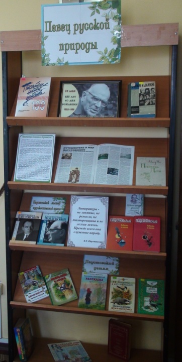 «Певец русской природы» - под таким названием в отделе обслуживания Центральной библиотеки открылась книжная выставка, посвященная 125-летию со дня рождения К. Г. Паустовского. Произведения Паустовского полны чистоты и выразительности. Недаром его называют певцом родной природы, но вместе с тем он замечательно, живо и искренне пишет о тех, кого знал, — об Эдуарде Багрицком, о Максиме Горьком, Михаиле Пришвине, Булгакове и других известных людях. Так, на выставке представлена книга писателя «Близкие и далекие», в которую вошли очерки, статьи, главы из книг об известных людях, знаменитых писателях и художниках.