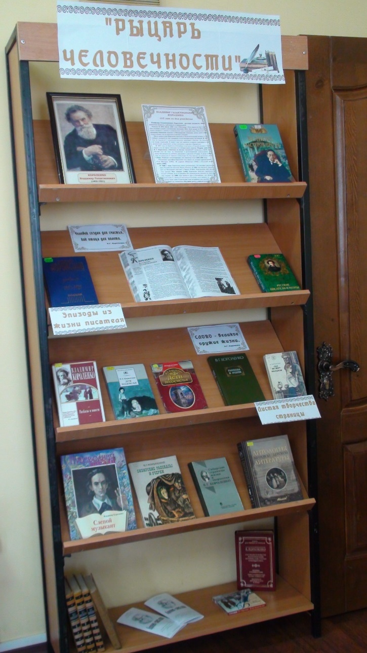 В зале абонемента Центральной библиотеки экспонируется книжная выставка «Рыцарь человечности», посвященная 165-летию со дня рождения писателя, журналиста, публициста и общественного деятеля Короленко Владимира Галактионовича. На выставке представлены не только произведения известного правозащитника, но и биографические книги о жизни и работе писателя. Особое место на выставке занимает «Дневник. 1917-1921», где основная часть дневника выдающегося русского писателя В.Г.Короленко публикуется впервые. Особое внимание читателя привлекут записи, фиксирующие трагические события революции и гражданской войны в России. С не меньшим интересом будут прочитаны письма, адресованные А.Луначарскому и М.Горькому.