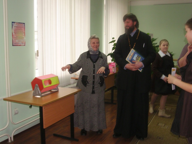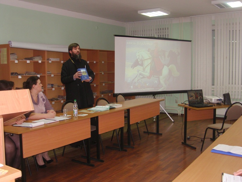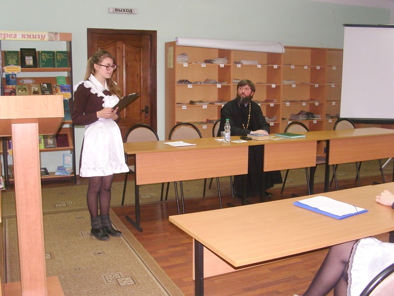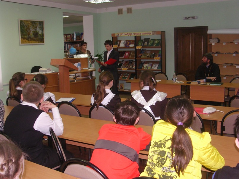 В читальном зале отдела обслуживания пользователей для учащихся старших классов был организован открытый урок православия. Участники мероприятия познакомились с историей создания первой печатной книги «Апостол», узнали о первом русском мастере печатного слова Иване Федорове. Священник Василий, настоятель храма святой великомученицы Варвары, рассказал ребятам о наиболее почитаемых духовных книгах, о призвании, долге, ответственности священнослужителей.