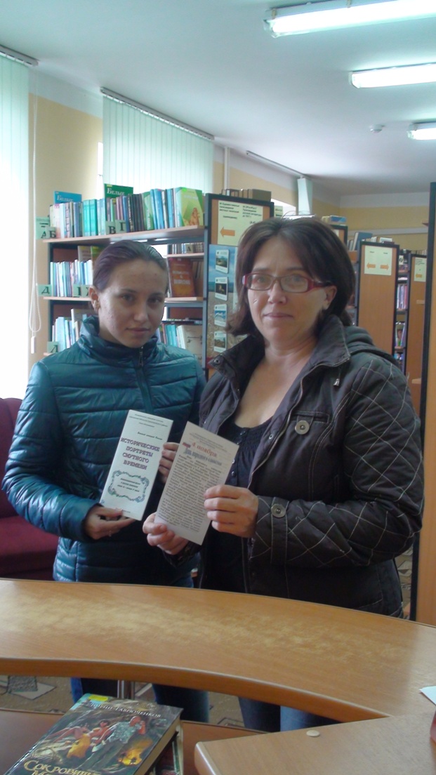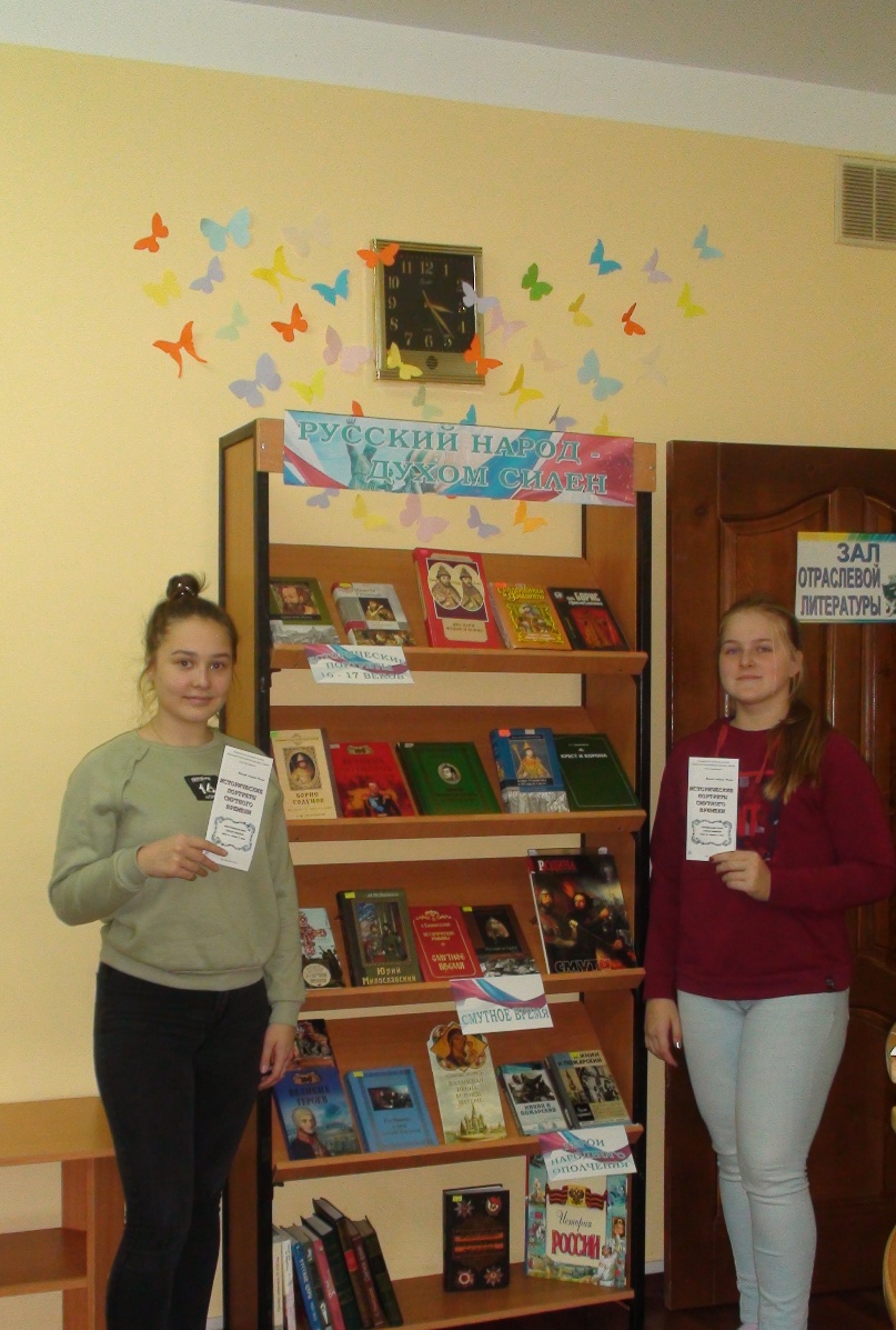 4 ноября на абонементе отдела обслуживания прошла информационная акция «День народного единства». Для посетителей в этот день был подготовлен краткий обзор исторических событий, положенных в основу праздника – Дня народного единства, и вручены буклеты «Исторические портреты Смутного времени». В обзоре библиотекарь отметила основные периоды Смутного времени, предпосылки данного события на Руси, представила биографии известных героев того времени: К. Минина и Д. Пожарского. Информация о русских царях, занимавших трон с конца 16 и начала 17 веков, была дана в информационных буклетах.