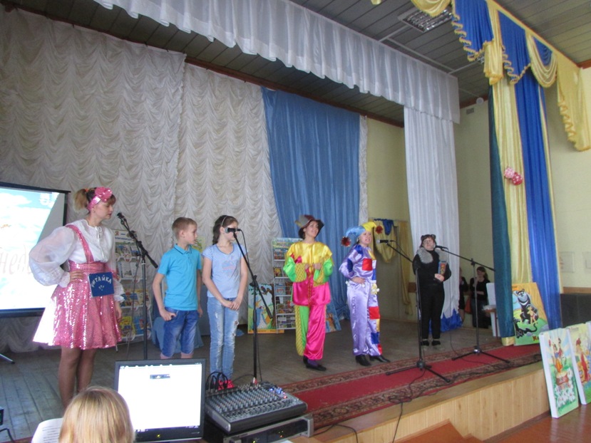 Открытие Недели детской книги прошло в актовом зале СОШ №1 и организовали его сотрудники детской библиотеки совместно с ЦДОД. На данном празднике собрались дети 1-4 классов со своими учителями и воспитателями. Сцена была украшена книжными выставками «Страна сказок, чудес и волшебства», «Я – книга именинница!», книгами-муляжами, воздушными шарами. Ребята замерли в ожидании, когда на сцене появилась Читайка – добрая, любящая книги и чтение девочка. Она исполнила песню о чтении и пригласила ребят на Книжкины именины. Для того чтобы попасть на праздник, нужно было найти волшебную книгу и произнести заклинание. И здесь на сцену вышли мальчик и девочка с планшетами в руках и начали спорить с Читайкой о том, что книги – это прошлый век, в книгах ничего интересного нет, и лучше всего с друзьями в контакте общаться, в Интернете