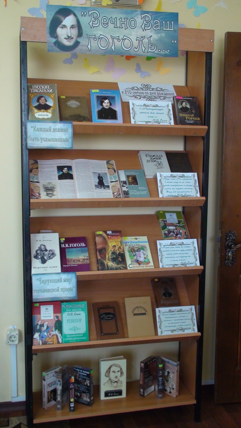К 210-летию со дня рождения классика в отделе обслуживания Центральной библиотеки открылась книжная выставка «Вечно Ваш, Гоголь…», на которой представлены художественные издания писателя, а также издания о жизни и творчестве Н.В. Гоголя. В истории русской литературы трудно найти фигуру более загадочную. Уже современники понимали, что Н. Гоголь - и человек, и художник - загадочен, непостижимо глубок, парадоксален, ни с чем несравним. Его называют первым профессиональным писателем в девятнадцатом веке. Творческая судьба Николая Васильевича считается счастливой: все произведения его были опубликованы при жизни, ни одно не обошла критика.