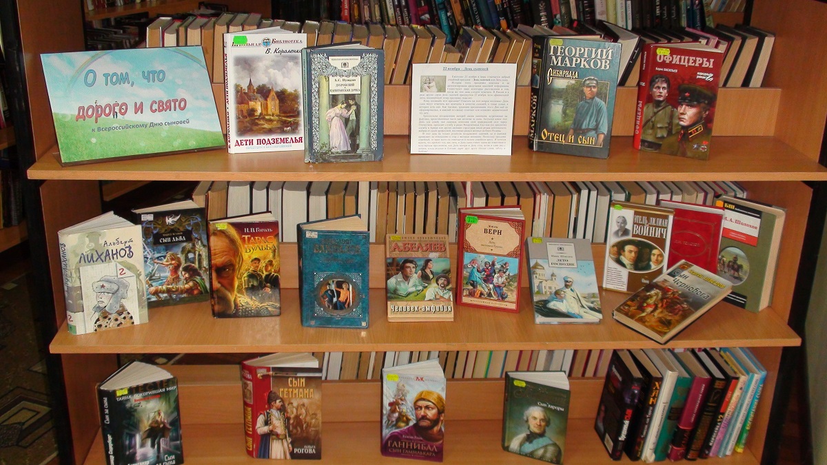 В рамках празднования 22 ноября Дня сыновей на абонементе отдела обслуживания была подготовлена книжная выставка «О том, что дорого и свято». На выставке представлены художественные произведения, где главным героем является сын. Все желающие могут посетить книжную выставку и познакомиться с такими известными рассказами, повестями, романами, как «Лето господнее» И. Шмелева, «Отец и сын» Г. Маркова, «Офицеры» Б. Васильева, «Старший сын» А. Вампилова, «Человек-Амфибия» А. Беляева, «Дети капитана Гранта» Ж. Верна и многими другими.